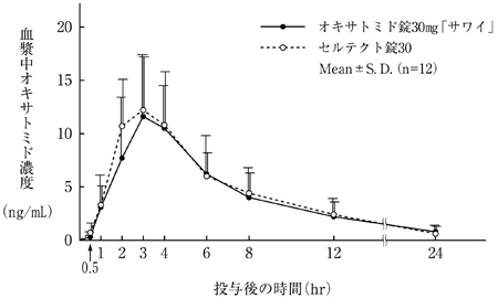 オキサトミド錠30mg「サワイ」とセルテクト錠30を健康成人男子にそれぞれ2錠(オキサトミドとして60mg)空腹時単回経口投与(クロスオーバー法)し、血漿中オキサトミド濃度を測定した。得られた薬物動態パラメータ(AUC、Cmax)について統計解析を行った結果、両剤の生物学的同等性が確認された3)。