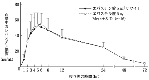 エバスチン錠5mg「サワイ」とエバステル錠5mgを健康成人男子にそれぞれ1錠(エバスチンとして5mg)空腹時単回経口投与(クロスオーバー法)し、活性代謝物であるカレバスチンの血漿中濃度を測定した。得られた薬物動態パラメータ(AUC、Cmax)について統計解析を行った結果、両剤の生物学的同等性が確認された2)。