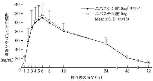 エバスチン錠10mg「サワイ」とエバステル錠10mgを健康成人男子にそれぞれ1錠(エバスチンとして10mg)空腹時単回経口投与(クロスオーバー法)し、活性代謝物であるカレバスチンの血漿中濃度を測定した。得られた薬物動態パラメータ(AUC、Cmax)について統計解析を行った結果、両剤の生物学的同等性が確認された2)。