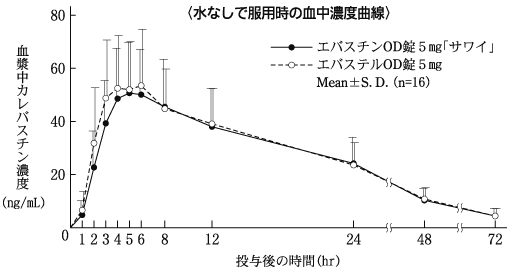 エバスチンOD錠5mg「サワイ」とエバステルOD錠5mgを健康成人男子にそれぞれ1錠(エバスチンとして5mg)空腹時単回経口投与(クロスオーバー法)し、活性代謝物であるカレバスチンの血漿中濃度を測定した。得られた薬物動態パラメータ(AUC、Cmax)について統計解析を行った結果、両剤の生物学的同等性が確認された3)。
