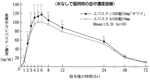エバスチンOD錠10mg「サワイ」とエバステルOD錠10mgを健康成人男子にそれぞれ1錠(エバスチンとして10mg)空腹時単回経口投与(クロスオーバー法)し、活性代謝物であるカレバスチンの血漿中濃度を測定した。得られた薬物動態パラメータ(AUC、Cmax)について統計解析を行った結果、両剤の生物学的同等性が確認された3)。