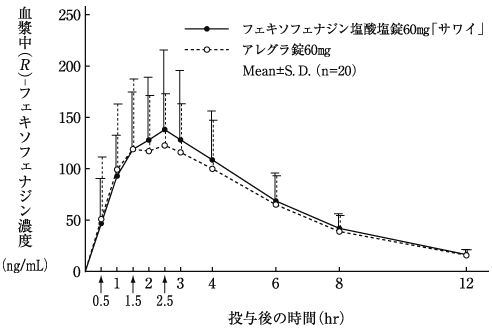 フェキソフェナジン塩酸塩錠60mg「サワイ」とアレグラ錠60mgを健康成人男子にそれぞれ1錠(フェキソフェナジン塩酸塩として60mg)空腹時単回経口投与(クロスオーバー法)し、血漿中(R)-フェキソフェナジン濃度を測定した。得られた薬物動態パラメータ(AUC、Cmax)について統計解析を行った結果、両剤の生物学的同等性が確認された4)。