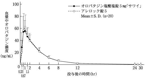 オロパタジン塩酸塩錠5mg「サワイ」とアレロック錠5を健康成人男子にそれぞれ1錠(オロパタジン塩酸塩として5mg)空腹時単回経口投与(クロスオーバー法)し、血漿中オロパタジン濃度を測定した。得られた薬物動態パラメータ(AUC、Cmax)について統計解析を行った結果、両剤の生物学的同等性が確認された3)。