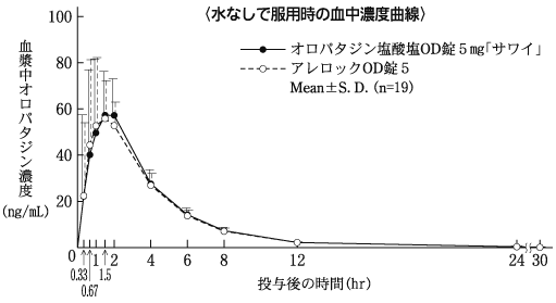 オロパタジン塩酸塩OD錠5mg「サワイ」とアレロックOD錠5を健康成人男子にそれぞれ1錠(オロパタジン塩酸塩として5mg)空腹時単回経口投与(クロスオーバー法)し、血漿中オロパタジン濃度を測定した。得られた薬物動態パラメータ(AUC、Cmax)について統計解析を行った結果、両剤の生物学的同等性が確認された3)。
