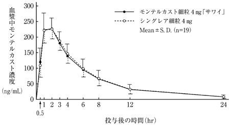 モンテルカスト細粒4mg「サワイ」とシングレア細粒4mgを健康成人男子にそれぞれ1包(モンテルカストとして4mg)空腹時単回経口投与(クロスオーバー法)し、血漿中モンテルカスト濃度を測定した。得られた薬物動態パラメータ(AUC、Cmax)について90%信頼区間法にて統計解析を行った結果、log(0.80)~log(1.25)の範囲内であり、両剤の生物学的同等性が確認された9)。
