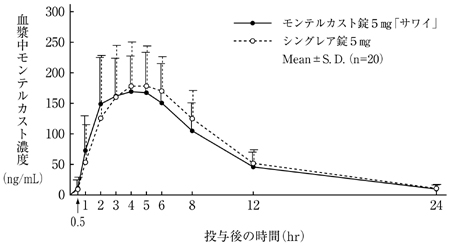モンテルカスト錠5mg「サワイ」とシングレア錠5mgを健康成人男子にそれぞれ1錠(モンテルカストとして5mg)空腹時単回経口投与(クロスオーバー法)し、血漿中モンテルカスト濃度を測定した。得られた薬物動態パラメータ(AUC、Cmax)について90%信頼区間法にて統計解析を行った結果、log(0.80)~log(1.25)の範囲内であり、両剤の生物学的同等性が確認された4)。