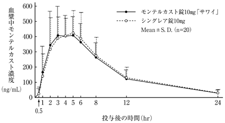 モンテルカスト錠10mg「サワイ」とシングレア錠10mgを健康成人男子にそれぞれ1錠(モンテルカストとして10mg)空腹時単回経口投与(クロスオーバー法)し、血漿中モンテルカスト濃度を測定した。得られた薬物動態パラメータ(AUC、Cmax)について90%信頼区間法にて統計解析を行った結果、log(0.80)~log(1.25)の範囲内であり、両剤の生物学的同等性が確認された4)。