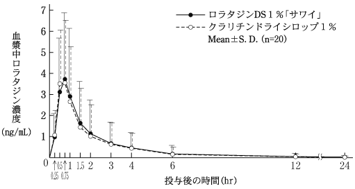 健康成人男性(20例)にロラタジンドライシロップ10mg又は錠10mgを空腹時に単回経口投与したとき、DCLの薬物動態パラメータは以下のとおりであった。ロラタジンドライシロップ10mgと錠10mgは生物学的に同等であることが確認された1)。