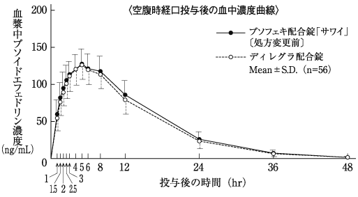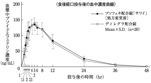 プソフェキ配合錠「サワイ」〔処方変更前〕とディレグラ配合錠を健康成人男子にそれぞれ1錠(フェキソフェナジン塩酸塩として30mg、塩酸プソイドエフェドリンとして60mg)単回経口投与(クロスオーバー法)し、フェキソフェナジン及びプソイドエフェドリンの血漿中濃度を測定した注1)。得られた薬物動態パラメータ(AUC、Cmax)について90%信頼区間法にて統計解析を行った結果、log(0.80)~log(1.25)の範囲内であり、両剤の生物学的同等性が確認された2)。