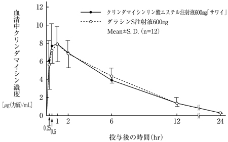 クリンダマイシンリン酸エステル注射液600mg「サワイ」とダラシンS注射液600mgを健康成人男子にそれぞれ1アンプル[クリンダマイシンリン酸エステルとして600mg(力価)]絶食時単回筋肉内投与(クロスオーバー法)し、血清中クリンダマイシン濃度を測定した。得られた薬物動態パラメータ(AUC、Cmax)について統計解析を行った結果、両剤の生物学的同等性が確認された5)。