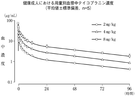 健康成人男子各群5例に2、4及び8mg/kgのテイコプラニンを30分かけて点滴静注したときの最高血漿中濃度はそれぞれ17.0、34.4及び71.8μg/mLを示し、投与後初期に比較的速やかに減少した後、終末半減期46~56時間ときわめて穏やかに消失した1)。