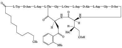 N-(Decanoyl)-L-tryptophyl-D-asparaginyl-L-aspartyl-L-threonylglycyl-L-ornithyl-L-aspartyl-D-alanyl-L-aspartylglycyl-D-seryl-(3R)-3-methyl-L-glutamyl-3-(2-aminobenzoyl)-L-alanine 1.13→3.4-lactone