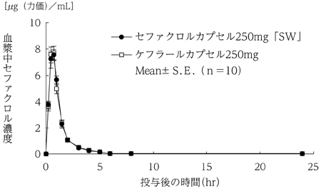 セファクロルカプセル250mg「SW」とケフラールカプセル250mgを健康成人男子にそれぞれ1カプセル[セファクロルとして250mg(力価)]空腹時単回経口投与(クロスオーバー法)し、血漿中セファクロル濃度を測定した。得られた薬物動態パラメータ(AUC、Cmax)について統計解析を行った結果、両剤の生物学的同等性が確認された3)。