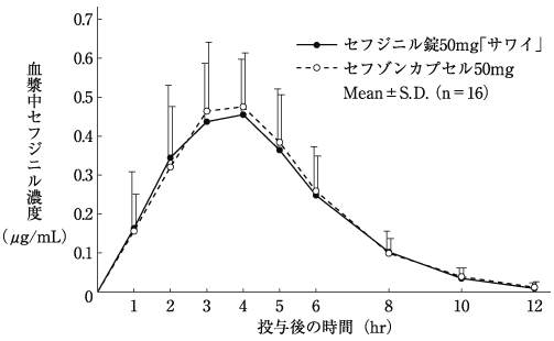 セフジニル錠50mg「サワイ」とセフゾンカプセル50mgを健康成人男子に1錠又は1カプセル[セフジニルとして50mg(力価)]空腹時単回経口投与(クロスオーバー法)し、血漿中セフジニル濃度を測定した。得られた薬物動態パラメータ(AUC、Cmax)について統計解析を行った結果、両剤の生物学的同等性が確認された3)。