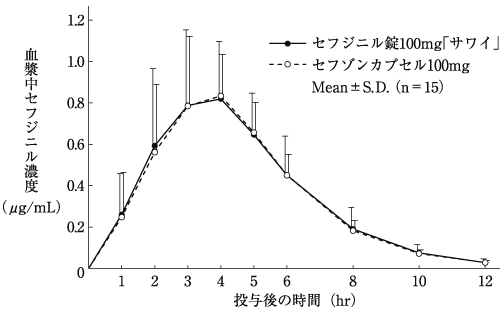 セフジニル錠100mg「サワイ」とセフゾンカプセル100mgを健康成人男子に1錠又は1カプセル[セフジニルとして100mg(力価)]空腹時単回経口投与(クロスオーバー法)し、血漿中セフジニル濃度を測定した。得られた薬物動態パラメータ(AUC、Cmax)について統計解析を行った結果、両剤の生物学的同等性が確認された3)。