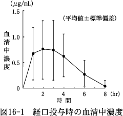 1~7歳の小児患者5例に3mg(力価)/kgを食後単回経口投与したときのセフカペンの血清中濃度を図16-1、薬物動態パラメータを表16-1に示す2)。