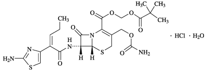 2,2-Dimethylpropanoyloxymethyl (6R,7R)-7-[(2Z)-2-(2-aminothiazol-4-yl)pent-2-enoylamino]-3-carbamoyloxymethyl-8-oxo-5-thia-1-azabicyclo[4.2.0]oct-2-ene-2-carboxylate monohydrochloride monohydrate