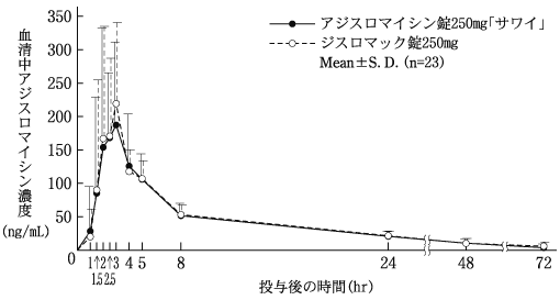 成人にはアジスロマイシンとして、500mg(力価)を1日1回、3日間合計1.5g(力価)を経口投与する。