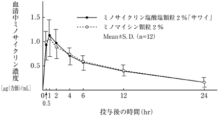 ミノサイクリン塩酸塩顆粒2%「サワイ」とミノマイシン顆粒2%を健康成人男子にそれぞれ5g[ミノサイクリン塩酸塩として100mg(力価)]空腹時単回経口投与(クロスオーバー法)し、血清中ミノサイクリン濃度を測定した。得られた薬物動態パラメータ(AUC、Cmax)について統計解析を行った結果、両剤の生物学的同等性が確認された4)。
