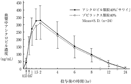 アシクロビル顆粒40%「サワイ」とゾビラックス顆粒40%を健康成人男子にそれぞれ0.5g(アシクロビルとして200mg)空腹時単回経口投与(クロスオーバー法)し、血漿中アシクロビル濃度を測定した。得られた薬物動態パラメータ(AUC、Cmax)について統計解析を行った結果、両剤の生物学的同等性が確認された8)。
