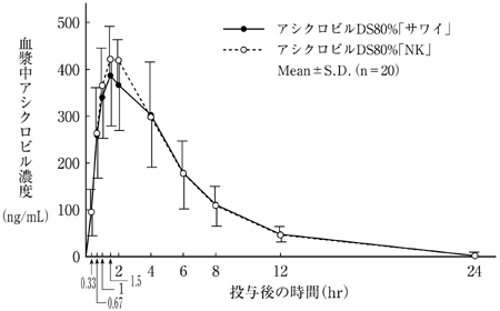 アシクロビルDS80%「サワイ」とアシクロビルDS80%「NK」を健康成人男子にそれぞれ0.25g(アシクロビルとして200mg)空腹時単回経口投与(クロスオーバー法)し、血漿中アシクロビル濃度を測定した。得られた薬物動態パラメータ(AUC、Cmax)について統計解析を行った結果、両剤の生物学的同等性が確認された8)。