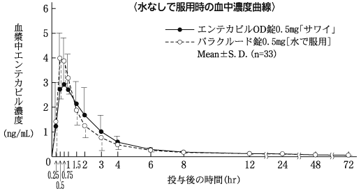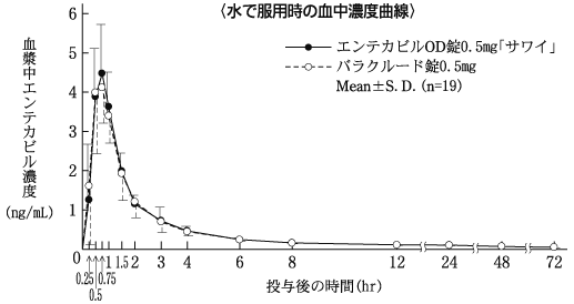 エンテカビルOD錠0.5mg「サワイ」(水なし又は水で服用)とバラクルード錠0.5mg(水で服用)を健康成人男子にそれぞれ1錠(エンテカビルとして0.5mg)空腹時単回経口投与(クロスオーバー法)し、血漿中エンテカビル濃度を測定した。得られた薬物動態パラメータ(AUC、Cmax)について90%信頼区間法にて統計解析を行った結果、log(0.80)~log(1.25)の範囲内であり、両剤の生物学的同等性が確認された3)。
