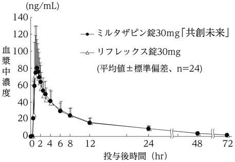 ミルタザピン錠15mg「共創未来」は、「含量が異なる経口固形製剤の生物学的同等性試験ガイドライン(平成24年2月29日 薬食審査発0229第10号)」に基づき、ミルタザピン錠30mg「共創未来」を標準製剤としたとき、溶出挙動が等しく、生物学的に同等とみなされた7)。