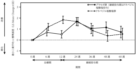 143例が治療期を完了し、そのうち139例が継続投与期に移行し、105例が継続投与期を完了した。副次評価項目である各評価時期(治療期及び継続投与期)におけるMMSEのベースラインからの変化量の推移は下図のとおりであった。