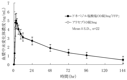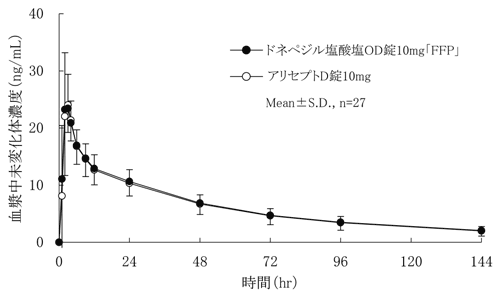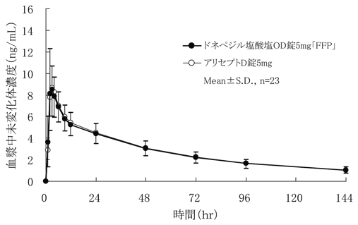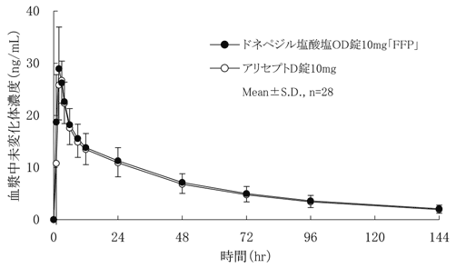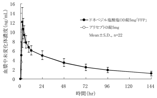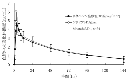 ドネペジル塩酸塩OD錠3mg「FFP」とアリセプトD錠3mgを、クロスオーバー法によりそれぞれ1錠(ドネペジル塩酸塩として3mg)健康成人男子に絶食時単回経口投与(水で服用及び水なしで服用)して血漿中未変化体濃度を測定し、得られた薬物動態パラメータ(AUC、Cmax)について90%信頼区間法にて統計解析を行った結果、log(0.80)~log(1.25)の範囲内であり、両製剤の生物学的同等性が確認された3)。