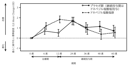 本試験では、認知機能障害、精神症状・行動障害の両症状に対するドネペジル塩酸塩の有効性がプラセボに比較して優れているという検証仮説は検証されていない20)。