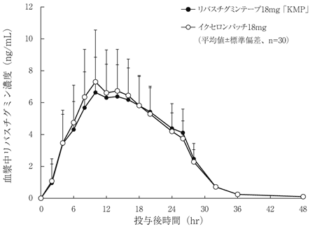 健康成人にリバスチグミン貼付剤9mgもしくは18mgを1日1回反復投与(5日間貼付)したときの投与5日目の血漿中薬物動態パラメータを以下に示す。血漿中リバスチグミンは貼付8時間後に最高血漿中濃度(Cmax)に到達し、貼付24時間後(貼付終了時)まで緩やかに減少した。Cmaxはリバスチグミン貼付剤9mgで3.39±1.44ng/mL、18mgで8.27±2.31ng/mL(平均値±標準偏差)であった1)。