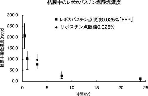 日本白色家兎にレボカバスチン点眼液0.025%「FFP」あるいはリボスチン点眼液0.025%を点眼後0.5、1、3、8及び24時間に眼瞼結膜を摘出し結膜中薬物濃度を測定した。結膜中の薬物濃度は、レボカバスチン点眼液0.025%「FFP」の点眼0.5時間後に最高値(199.19ng/g)を示した後、一次速度式に従って徐々に消失した。レボカバスチン点眼液0.025%「FFP」とリボスチン点眼液0.025%の値を用いてStudentのt検定にて統計解析を行った結果、いずれの測定点においても両剤の間に有意な差は認められず、両剤の生物学的同等性が確認された5)。