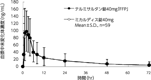 テルミサルタン錠40mg「FFP」とミカルディス錠40mgを、クロスオーバー法によりそれぞれ1錠(テルミサルタンとして40mg)健康成人男子に絶食単回経口投与して、血漿中未変化体濃度を測定し、得られた薬物動態パラメータ(AUC、Cmax)について90%信頼区間法にて統計解析を行った結果、log(0.80)~log(1.25)の範囲内であり、両製剤の生物学的同等性が確認された。