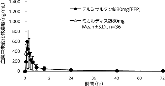テルミサルタン錠80mg「FFP」とミカルディス錠80mgを、クロスオーバー法によりそれぞれ1錠(テルミサルタンとして80mg)健康成人男子に絶食単回経口投与して、血漿中未変化体濃度を測定し、得られた薬物動態パラメータ(AUC、Cmax)について統計解析を行った結果、評価パラメータの対数値の平均値の差がlog(0.90)~log(1.11)であり、且つ、溶出試験で溶出挙動が類似していることから両剤の生物学的同等性が確認された。