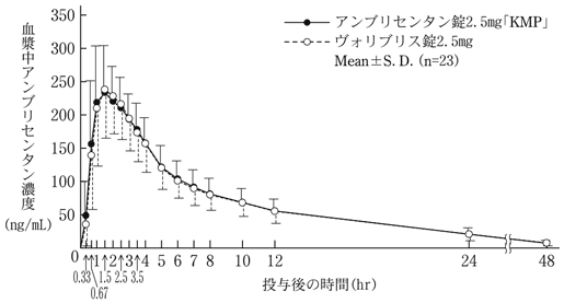 アンブリセンタン錠2.5mg「KMP」とヴォリブリス錠2.5mgを健康成人男性にそれぞれ1錠(アンブリセンタンとして2.5mg)空腹時単回経口投与(クロスオーバー法)し、血漿中アンブリセンタン濃度を測定した。得られた薬物動態パラメータ(AUC、Cmax)について90%信頼区間法にて統計解析を行った結果、log(0.80)~log(1.25)の範囲内であり、両剤の生物学的同等性が確認された4)。