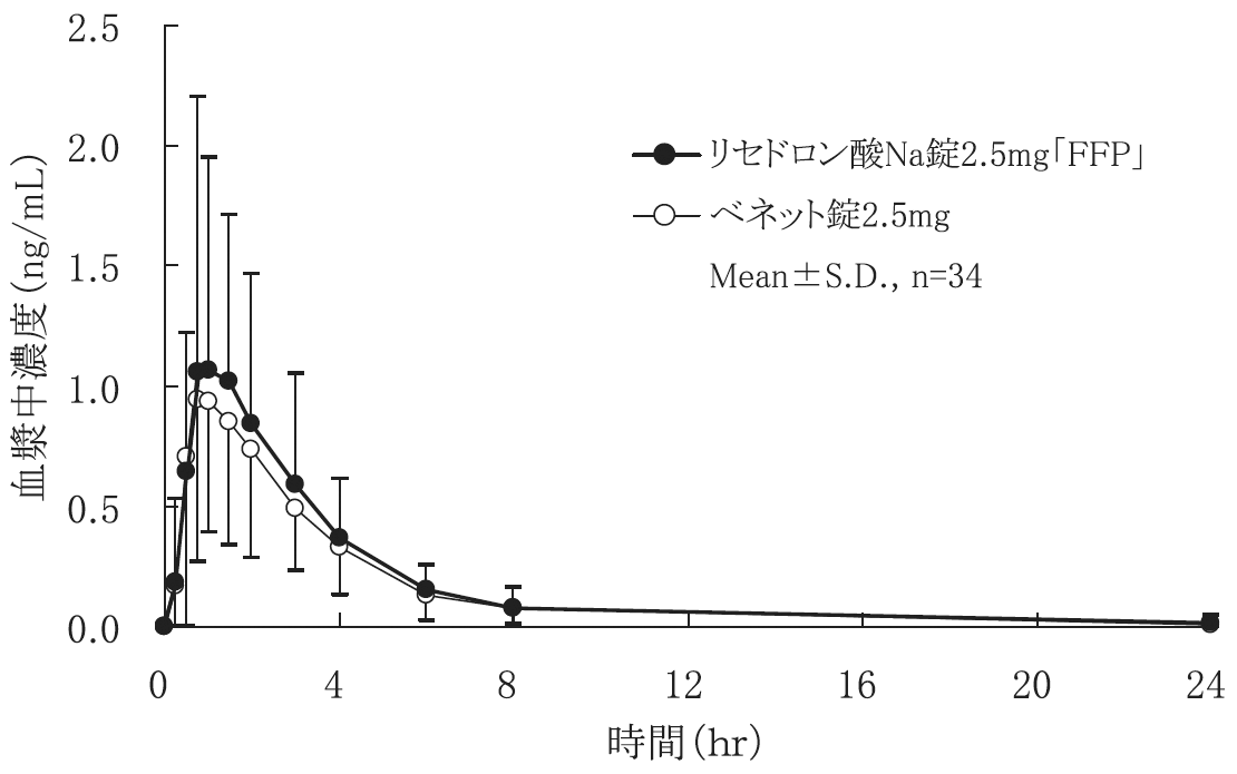 リセドロン酸Na錠2.5mg「FFP」とベネット錠2.5mgを、クロスオーバー法によりそれぞれ1錠(リセドロン酸ナトリウムとして2.5mg)健康成人男子に絶食時単回経口投与して血漿中未変化体濃度を測定し、得られた薬物動態パラメータ(AUC、Cmax)について90%信頼区間法にて統計解析を行った結果、log(0.80)~log(1.25)の範囲内であり、両製剤の生物学的同等性が確認された7)。