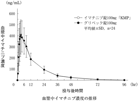 イマチニブ錠100mg「KMP」とグリベック錠100mgを、クロスオーバー法によりそれぞれ1錠(イマチニブとしてそれぞれ100mg)健康成人男子に絶食単回経口投与して血漿中未変化体濃度を測定した。得られた薬物動態パラメータ(AUC、Cmax)について90%信頼区間法にて統計解析を行った結果、log(0.80)~log(1.25)の範囲であり、両剤の生物学的同等性が確認された5)。