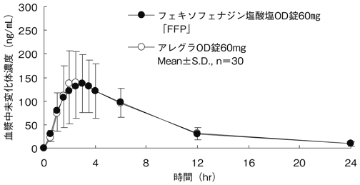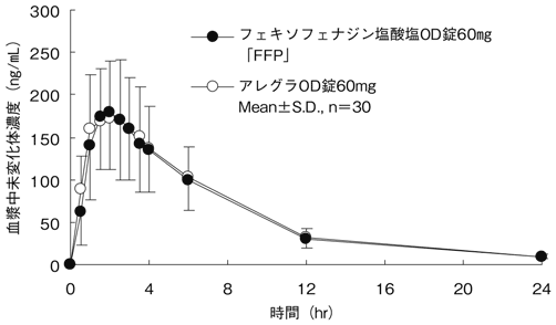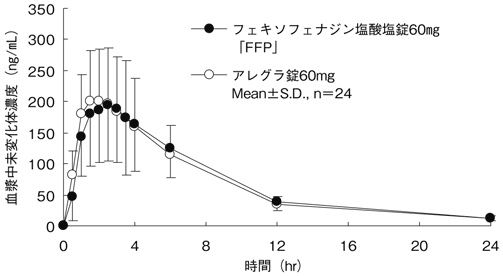 フェキソフェナジン塩酸塩錠60mg「FFP」とアレグラ錠60mgを、クロスオーバー法によりそれぞれ1錠(フェキソフェナジン塩酸塩として60mg)健康成人男子に絶食時単回経口投与して、血漿中未変化体濃度を測定し、得られた薬物動態パラメータ(AUC、Cmax)について90%信頼区間法にて統計解析を行った結果、log(0.80)~log(1.25)の範囲内であり、両製剤の生物学的同等性が確認された4)。