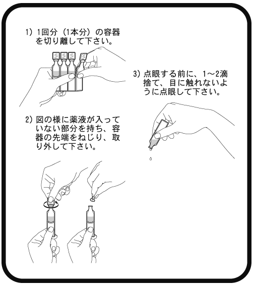 通常成人では1~4滴を点眼する。なお、年令、体質により適宜増減する。