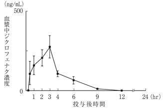 健康成人に14C-ジクロフェナクナトリウム50mgを経口投与又は静脈内投与した場合、投与後12時間で投与量の約40%が尿中に、96時間で約60%が尿中に、約30%が糞中に排泄される8)(外国人データ)。
