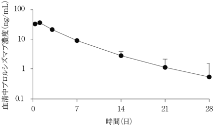 日本人及び外国人加齢黄斑変性患者に本剤6mgを単回硝子体内投与したとき、血清中VEGF非結合形ブロルシズマブ濃度推移及び薬物動態パラメータは以下のとおりであった。また、本剤6mgを4週ごとに3回投与したとき、血清中VEGF非結合形ブロルシズマブ濃度の累積は認められなかった2)。