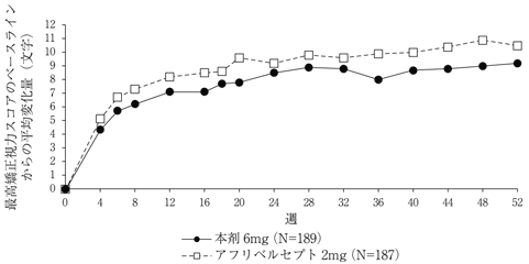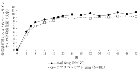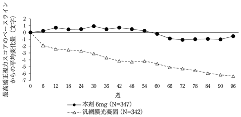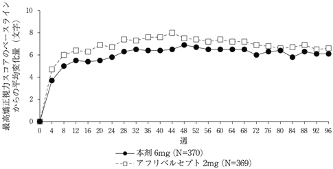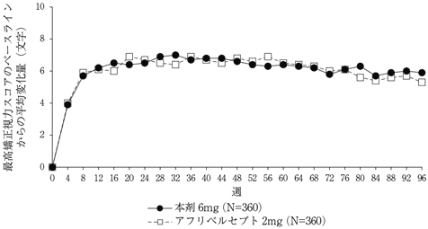 **母集団薬物動態/薬力学モデルによるシミュレーションにおいて、滲出型加齢黄斑変性患者を対象に、本剤6mgを導入期として6週毎に2回硝子体内投与、2回投与後に疾患活動性が認められた場合注)は1回追加投与し、その後の維持期において12週又は疾患活動性が認められた場合は8週毎に投与した際の最高矯正視力スコアのベースラインからの変化量は、本剤6mgを導入期として4週毎に3回投与し、その後の維持期において12週又は疾患活動性が認められた場合は8週毎に投与した際と同様の推移を示すことが予測された4)。注)疾患活動性の有無はシミュレーションされた中心サブフィールド厚に基づき評価された。
