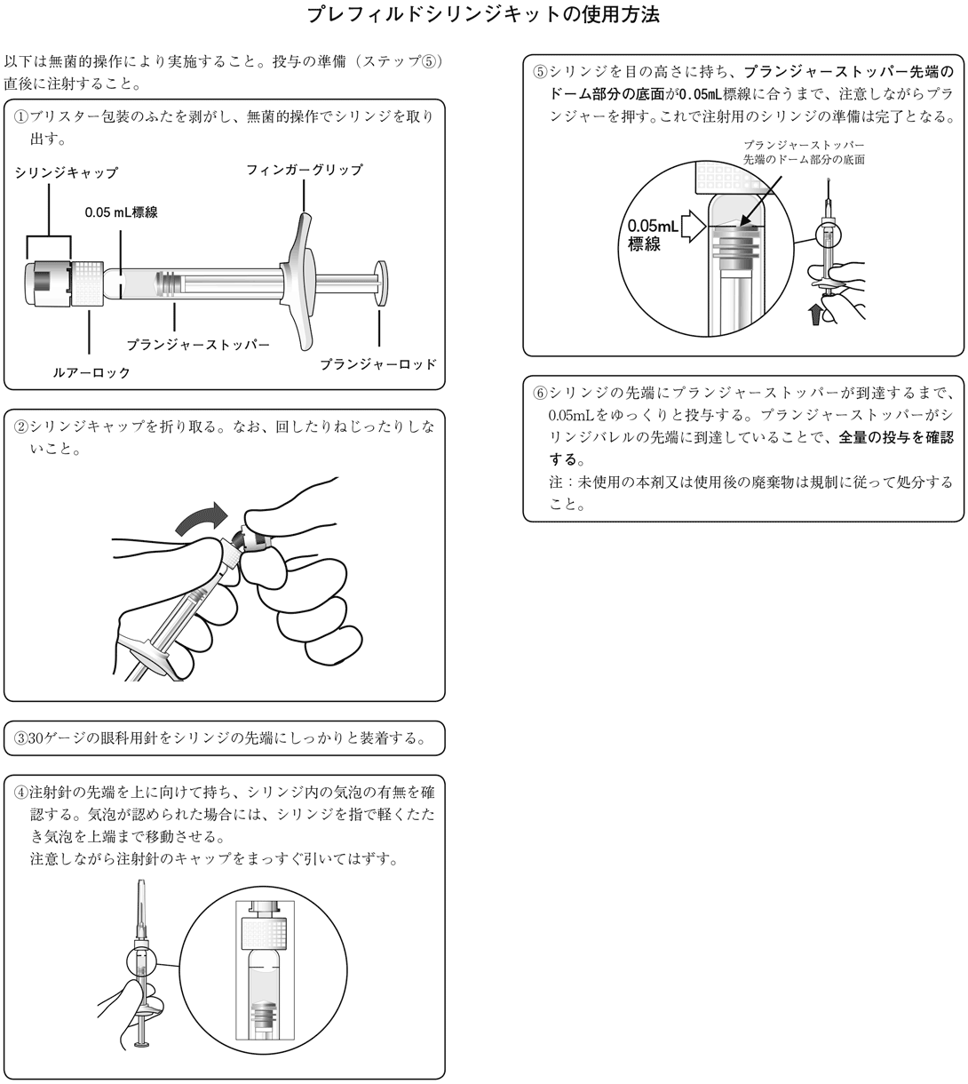 眼内炎(0.4%)、眼内炎症(ぶどう膜炎等)(3.4%)、網膜色素上皮裂孔(0.6%)、網膜剥離(0.1%)、網膜裂孔(0.5%)、網膜血管炎(0.3%)、網膜動脈閉塞(0.3%)、網膜血管閉塞(0.3%)、硝子体出血(0.7%)があらわれることがある。本剤投与により眼内炎症があらわれた患者に対して再投与した場合に、眼内炎症が再発した症例が報告されている。網膜血管炎及び網膜血管閉塞の発現には本剤への免疫応答が関与していることが報告されており、網膜血管炎又は網膜血管閉塞があらわれた患者では、再発するおそれがあるため、本剤を再投与しないこと。これらの事象は眼内炎症(ぶどう膜炎、虹彩炎、硝子体炎、虹彩毛様体炎等)に併発することがあるため、眼内炎症があらわれた場合は、患者の状態を十分に観察すること。,,