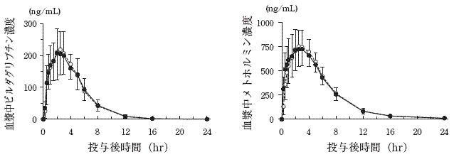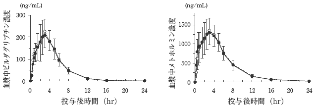 健康成人男子を対象としたビルダグリプチン/メトホルミン塩酸塩50mg/250mg配合錠と単剤併用の生物学的同等性試験(49例)、並びにビルダグリプチン/メトホルミン塩酸塩50mg/500mg配合錠と単剤併用の生物学的同等性試験(48例)のデータを以下に示す。本剤及び単剤併用をクロスオーバー法により空腹時に単回経口投与したとき、ビルダグリプチン及びメトホルミンの血漿中濃度推移及び薬物動態パラメータは図表のとおりであり、生物学的同等性が認められた3) 。