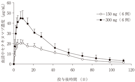 日本人健康成人男子にセクキヌマブ(遺伝子組換え)150mg又は300mgを単回皮下投与したとき、血清中セクキヌマブ濃度は投与後8日目にCmaxを示し、消失半減期は26~30日であった。また、絶対バイオアベイラビリティは77%であった。