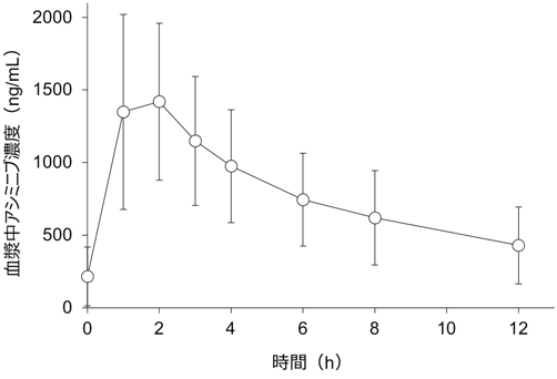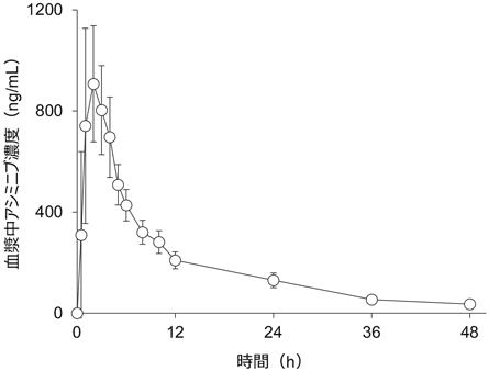 日本人健康成人に本剤40mg注1)を空腹時に単回経口投与したときの薬物動態パラメータ及び血漿中濃度推移は以下のとおりであった1)。