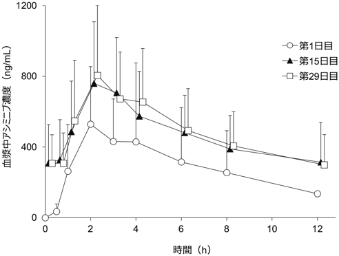 日本人を含む前治療薬に抵抗性又は不耐容の慢性骨髄性白血病患者に、本剤40mg注1)を空腹時に1日2回反復経口投与したときの薬物動態パラメータ及び血漿中濃度推移は以下のとおりであり、投与29日目の累積比は1.65であった。また、本剤10~200mg注1)を1日2回反復経口投与したとき、Cmax及びAUCは用量比を上回って増加した3)。