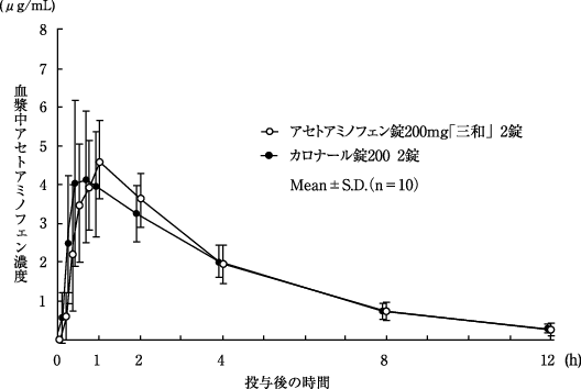 アセトアミノフェン錠200mg「三和」とカロナール錠200それぞれ2錠(アセトアミノフェン400mg)を10名の健康成人男性にクロスオーバー法により早朝空腹時に単回経口投与し、血漿中アセトアミノフェン濃度を測定した。得られた薬物動態パラメータ(AUC、Cmax)について90%信頼区間法にて統計解析を行った結果、log(0.8)~log(1.25)の範囲内であり、両剤の生物学的同等性が確認された2)。