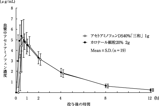 アセトアミノフェンDS40%「三和」1gとカロナール細粒20% 2g(アセトアミノフェン400mg)を19名の健康成人男性にクロスオーバー法により早朝空腹時に単回経口投与し、血漿中アセトアミノフェン濃度を測定した。得られた薬物動態パラメータ(AUC、Cmax)について90%信頼区間法にて統計解析を行った結果、log(0.8)~log(1.25)の範囲内であり、両剤の生物学的同等性が確認された3)。
