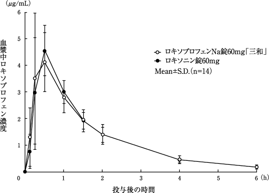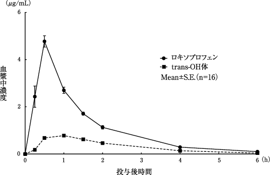 健康成人男性16例にロキソプロフェンナトリウム錠60mgを単回経口投与したところ、速やかに吸収され、血中にはロキソプロフェン(未変化体)のほか、trans-OH体(活性代謝物)の型で存在した。最高血漿中濃度に到達する時間はロキソプロフェンで約30分、trans-OH体で約50分であり、半減期はいずれも約1時間15分であった2)。